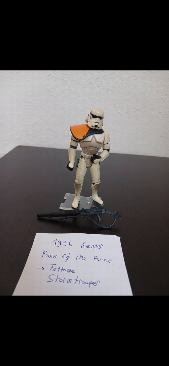 1996 Kenner Star Wars Stormtrooper figürü, turuncu omuz pauldronu ve siyah silah aksesuarı ile birlikte geliyor. Power of the Force serisine ait. ⚔️■Tattoine Stormtrooper (1996 Kenner)◇*450* TL