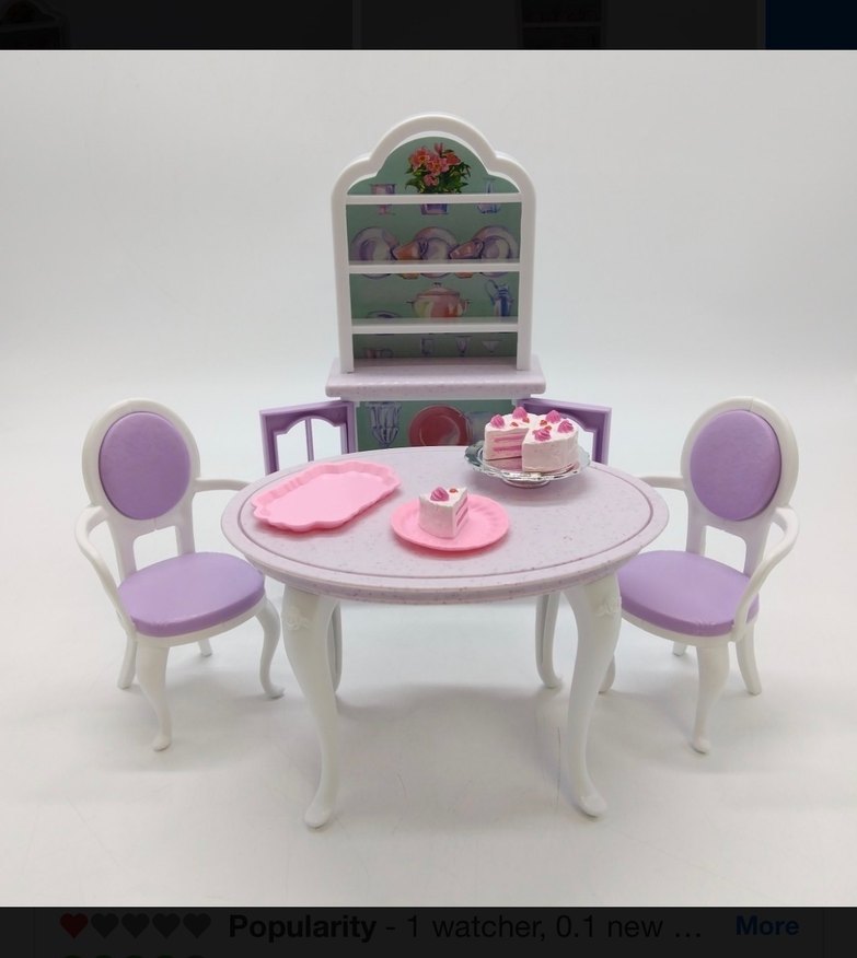 1996 Mattel Vintage Barbie Dining set. Dolap, sandalyeler ve masası duruyor fakat masanın bacakları ve yemek parçaları kayıp. Koleksiyon yapan birine gitmesi tercihim bu sebeple satışa koyuyorum.