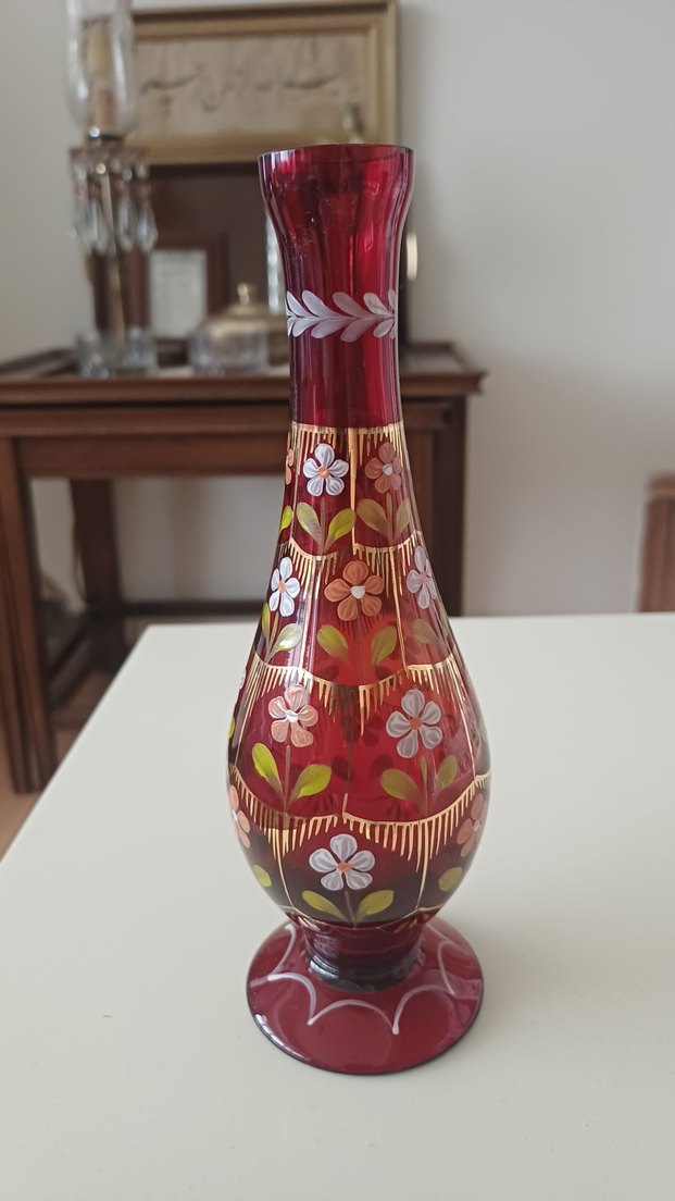 Kırmızı cam üzeri altın yaldızlı,mine desenli.Çiziksiz, çatlaksızdır.Yaldızları ve motifleri eksiksiz.Tertemiz.Koleksiyonluk.