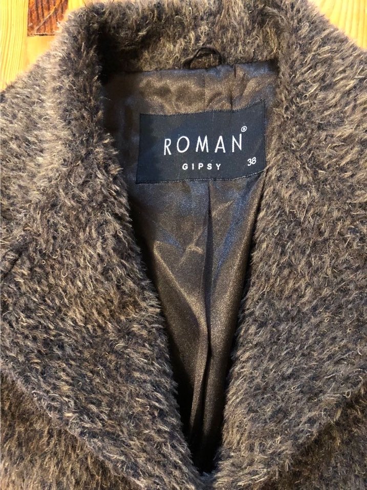 1998 sonbahar-kış sezonuna ait 27 yıllık vintage bir paltodur. Kahverengi, kürklü detaylı, yün kumaştan, uzun kollu, normal boy midi kadın kaban. Notch yaka ve baskılı desene sahiptir. Roman Gipsy markalıdır.