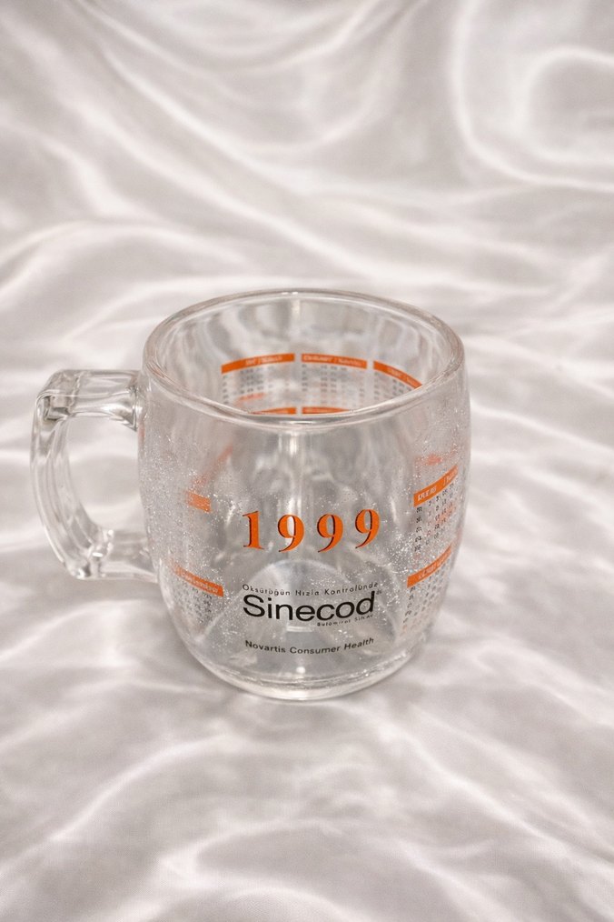 Parlak kendinden çatlamış efektli"1999" ve "Sinecod" yazılı, saplı şeffaf plastik kupa. Rahat tutuş sağlar. ☕ hiç kullanılmamıştır. Vitrin ürünüdür. Koleksiyonerlerin ilgisini çekebilecek bir ürün.