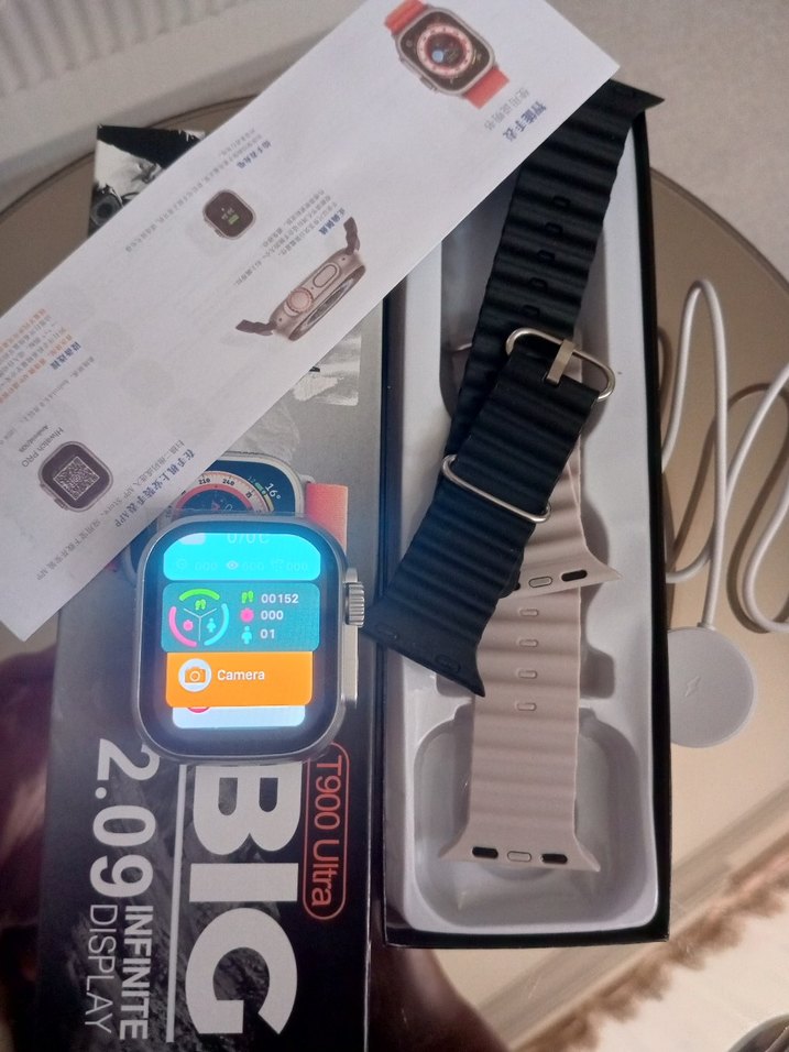 2,09 inç canlı ekrana sahip siyah akıllı saat, kamera ve çoklu işlevlerle. Siyah ve bej renklerde değiştirilebilir kayışlar ile birlikte. ⌚