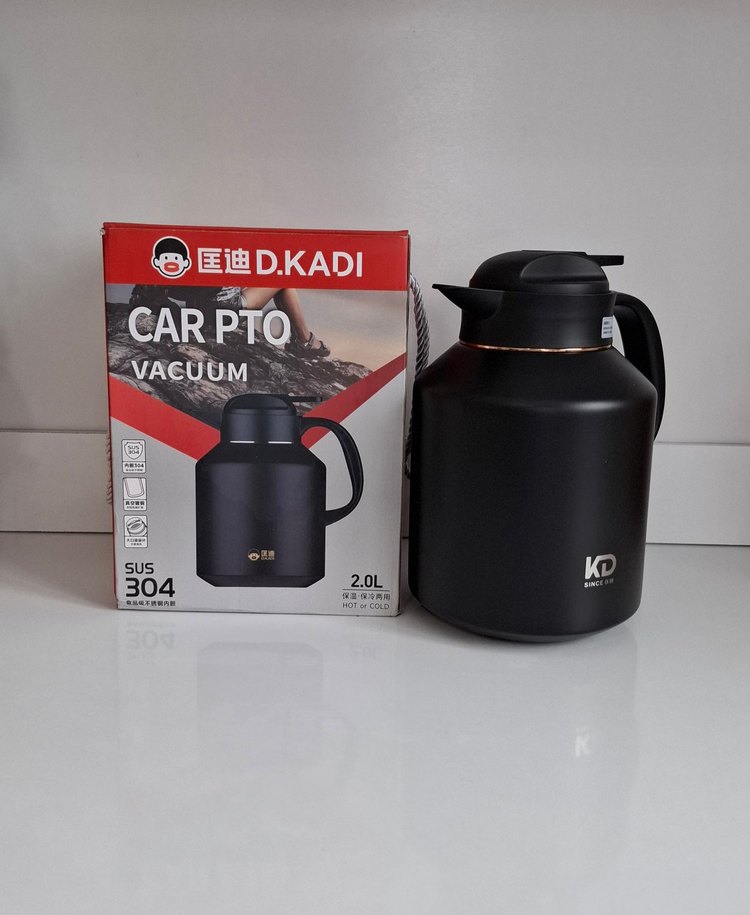 2.0 litrelik siyah termos şişesi, vakum yalıtımlı olup içecekleri sıcak veya soğuk tutar. Dayanıklı SUS 304 malzemeden üretilmiş, taşıması kolay saplıdır.