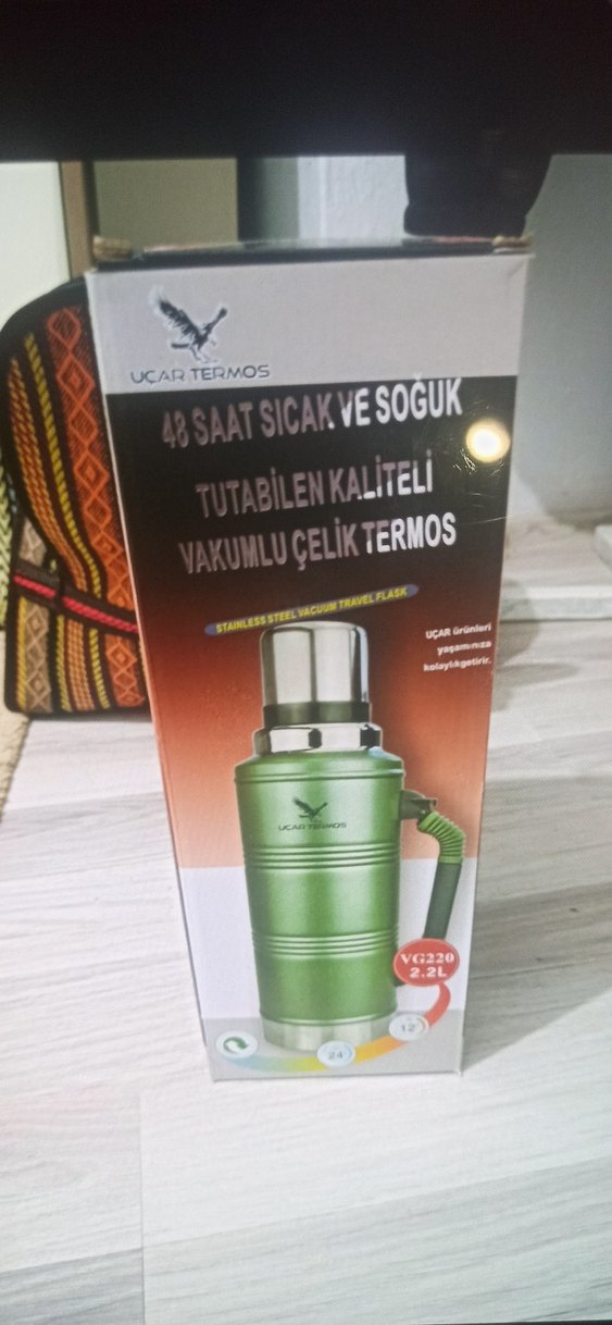 2.2L hacminde, haki renkli vakumlu çelik termos, içecekleri 48 saate kadar sıcak veya soğuk tutar. Taşıma için kaliteli sapı vardır.
