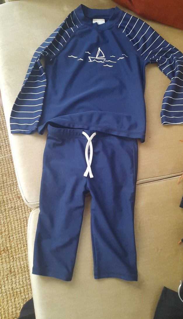 Koyu mavi renkte, uzun kollu ve yumuşak dokulu Basit ve şık tasarımlı, yelkenli desenli ve çizgili kollu.mayo takımı