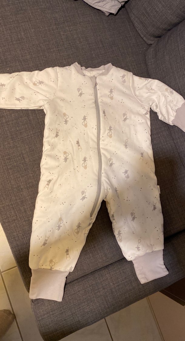 Beyaz ve desenli bebek uyku tulumu, fermuarlı ve kesimli yaka detayına sahiptir. Gri desenleri ve manşetleriyle rahat kullanım sağlar. ❄️ 1-2 kere giydi evinizin ortam şartlarına uymayınca daha düşük tog değerli tuluma geçmiştik.