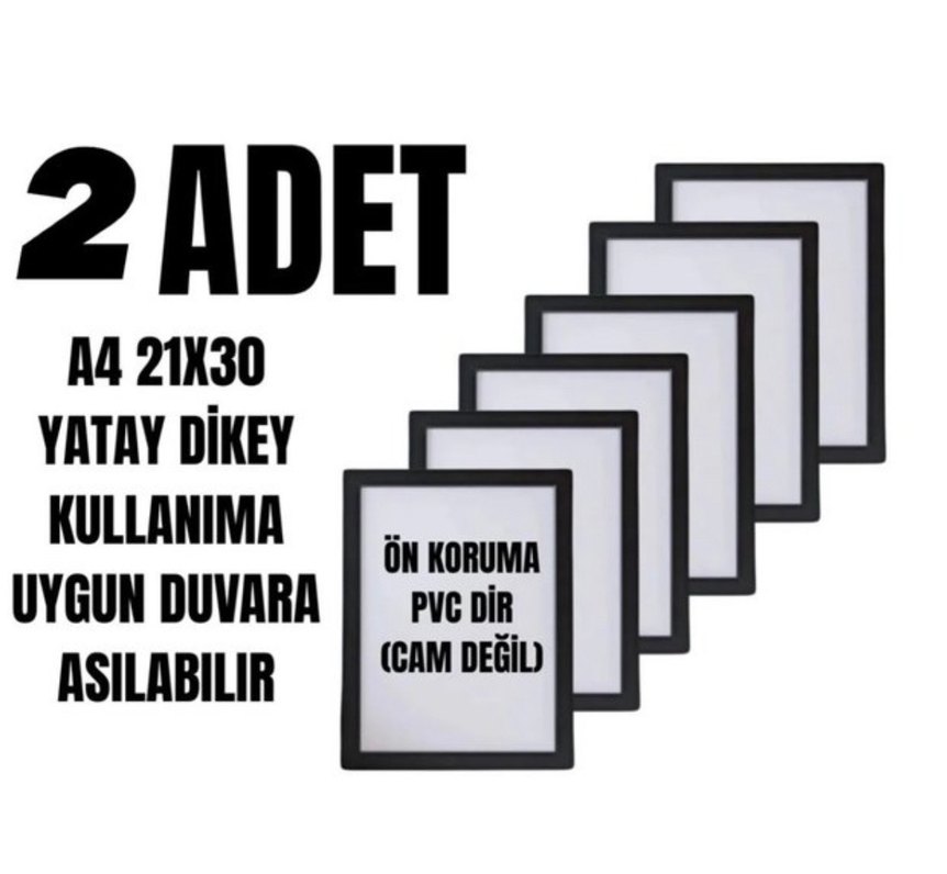 Yatay ve dikey kullanım için uygun, A4 21x30 cm boyutunda, önü cam olmayan PVC korumalı, duvara asılabilir 2 adet çerçeve. Çerçeve kenarlarında hafif beyaz desenler var
