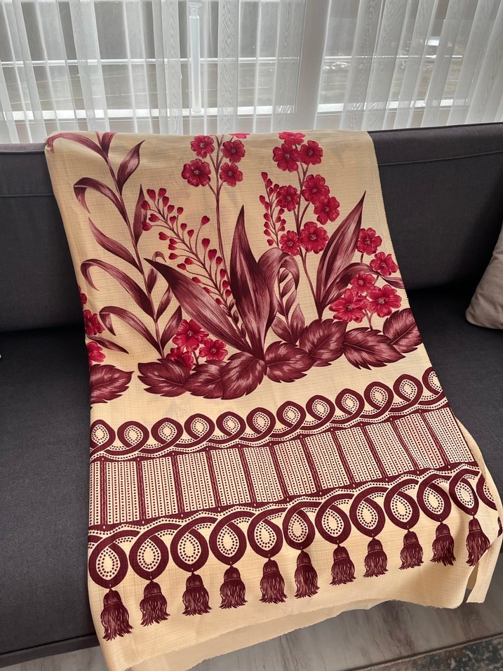 Bej zemin üzerinde bordo çiçek ve desenli konvansiyonel perde, püskül detaylarıyla tamamlanmıştır.