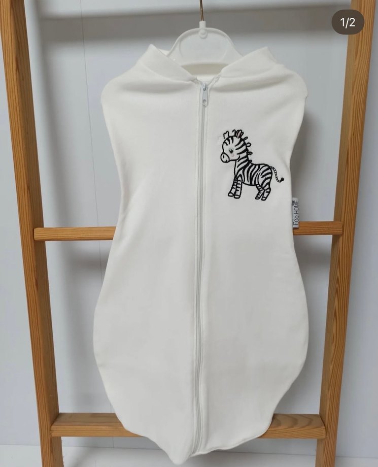 , önünde zebra desenli, yumuşak ve sıcak kumaştan yapılmış beyaz bebek uyku tulumu. Önden fermuarlıdır.