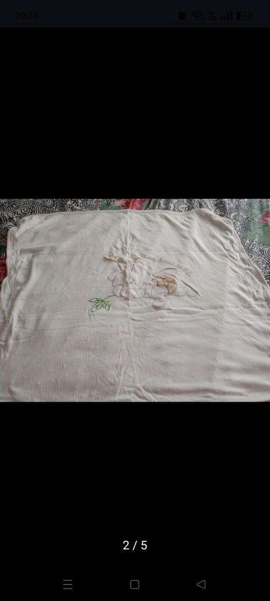 Yumuşak sentetik kumaştan, ışık beyaz ve mavi renkte, işlemeli desenli çocuk battaniyesi. 2 adet beyaz olanda durmaktan sararma mevcut