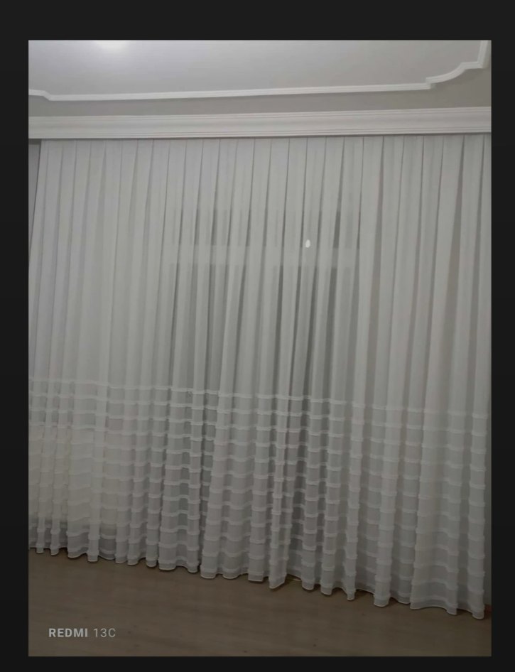 Beyaz, modern klasik tarzda, alt kısmında hafif yatay dokulu, desensiz perde. Odaya yumuşak ve şık bir hava katıyor.