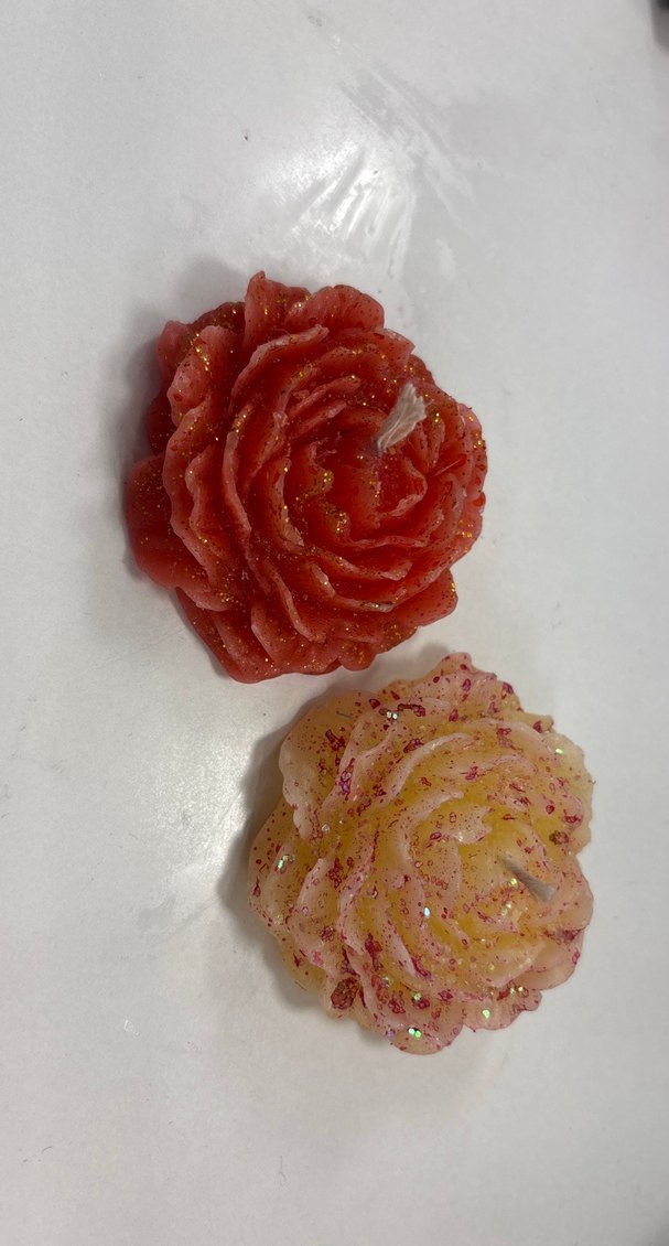 Simli detaylara sahip kırmızı ve sarı , çiçek şeklinde renkli bir mum. Avuca rahatça sığar ve dekoratif bir dokunuş sağlar. ️