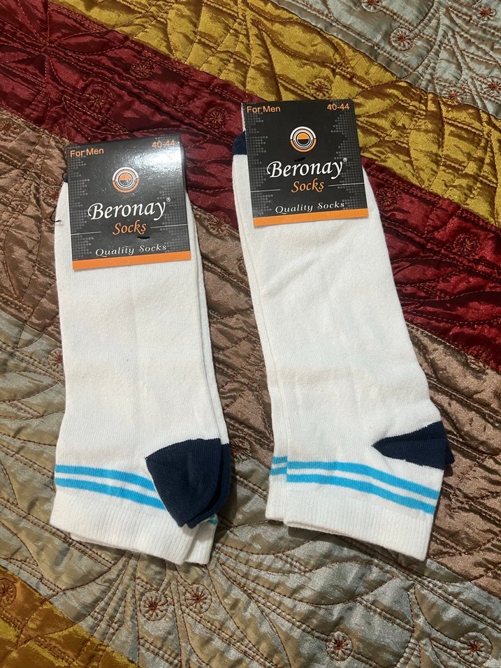 Beronay markalı, beyaz midi uzunlukta erkek çorapları, mavi çizgili ve koyu burunlu, rahat ve normal kesim. 40-44 numara. Etiketli