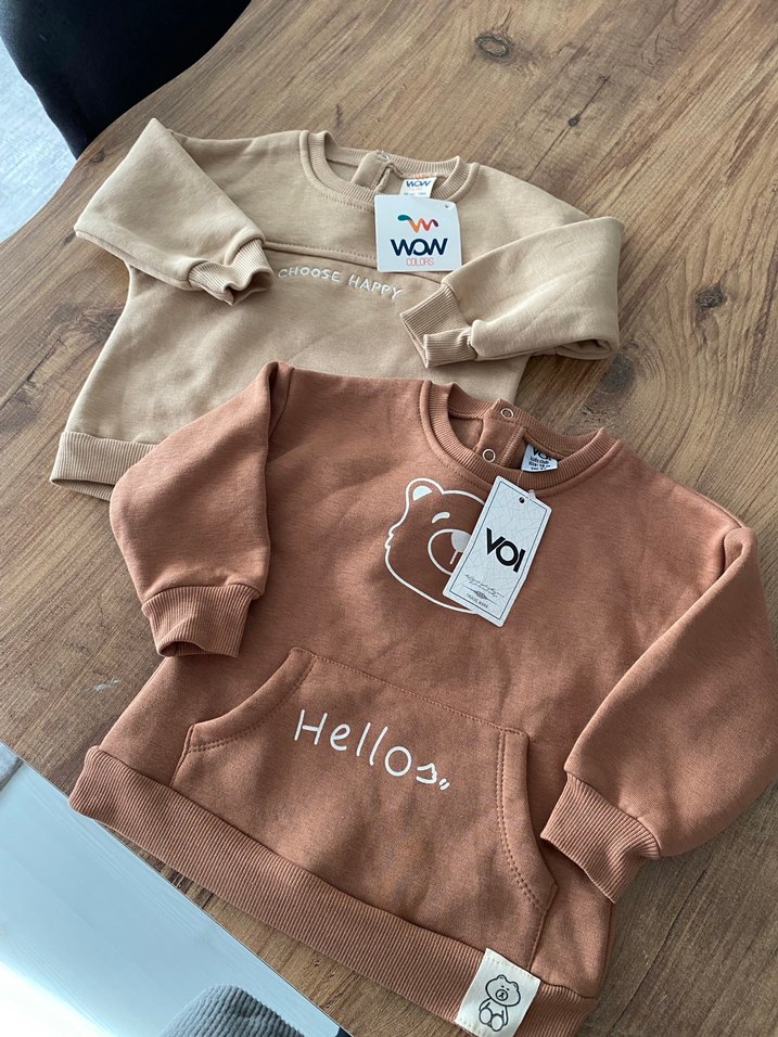 2 ADETİN FİYATIDIR Erkek çocuk sweatshirtü uzun kollu, yuvarlak yaka ve bol kesimdir. Yumuşak ve sıcak kumaştan, gri ayı baskısı ve "Hellos,"
