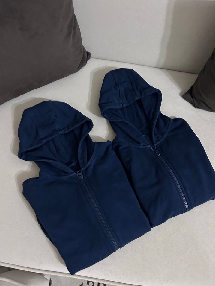 İkisi de 6-7 yaştır. Erkek çocuk için kapüşonlu, fermuarlı ve dar kesim sweatshirt. Yumuşak ve sıcak kumaştan, lacivert renkte, sade desensiz, uzun kollu.