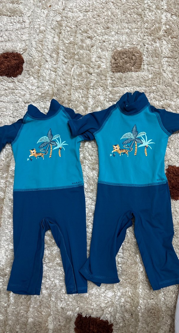 2 adet.Renkli baskılı, kısa kollu erkek çocuk mayo. Mavi tonlarında, palmiye ağaçları ve kaplan desenli. Yüksek yakalı ve rahat kesim.