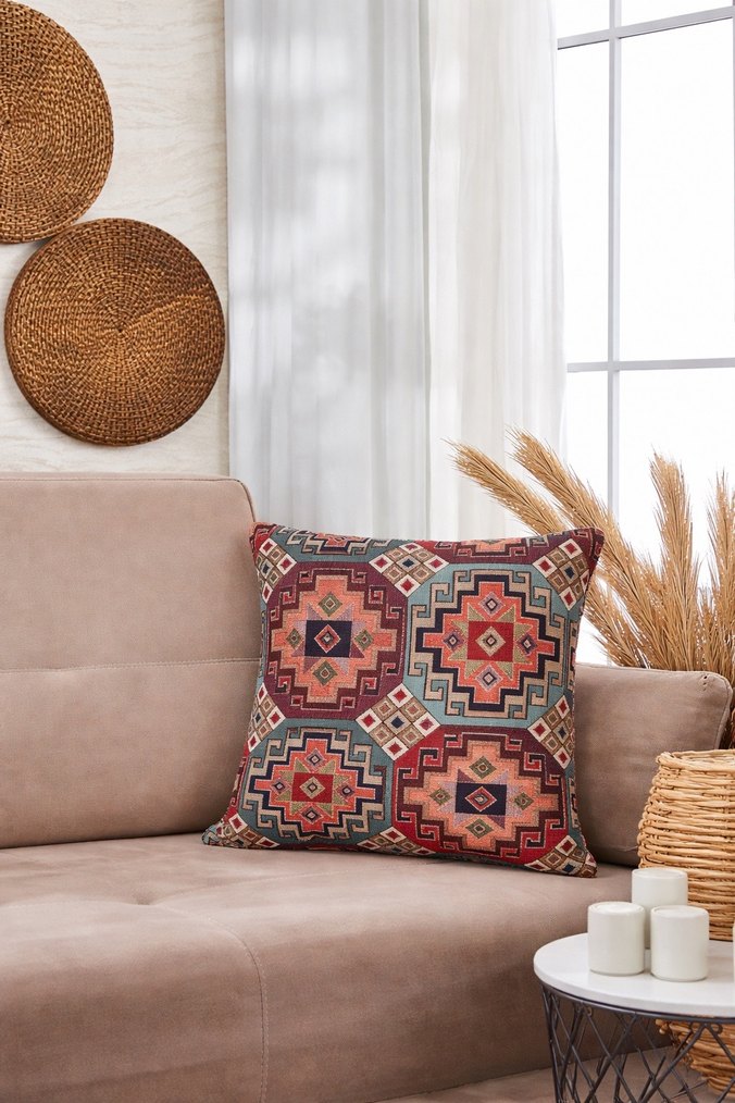 Koyu çok renkli etnik desenli geleneksel tarzda kırlent kılıfı, yaşam alanlarına sıcak ve geleneksel bir dokunuş katar. ️42x42 ölçülerinde desenli