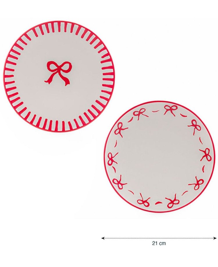 21 cm çapında, kırmızı ve beyaz renklerde, fiyonk desenli iki adet servis tabağı. ️