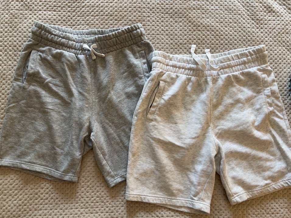 Gri pamuklu, rahat kesim erkek şortları. Lastikli bel ve yan ceplerle sade ve konforlu tasarım. İkisi de XS beden. Bir tanesi açık gri, diğeri gri renktedir. İçi şardonlu. 2 adet cepleri var. Uzunluk 46 cm bel 38 cm