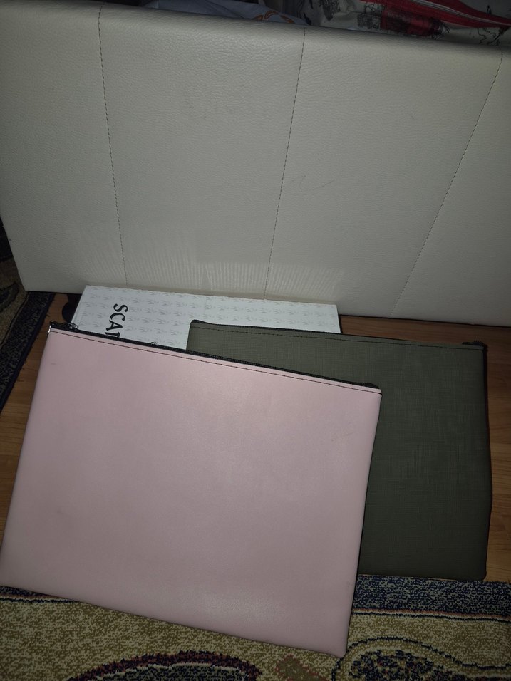 Pembe ve haki 2 adet deri clutch çanta, fermuarlı ve minimal baskılı tasarımla ofis için uygun, günlük de kullanılabilir.
