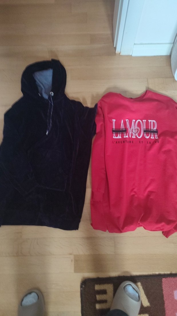 iki adet tunik. Mor kadife, diğeri sweatshirt kısa olan için elbise, uzun boylu için tunik. Rahat günlük kullanım için uygundur.
