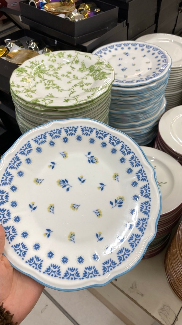 Yemek kabı, açık mavi kenar ve zarif çiçek desenine sahiptir, kullanışlı ve klasik bir görünüme sahiptir.