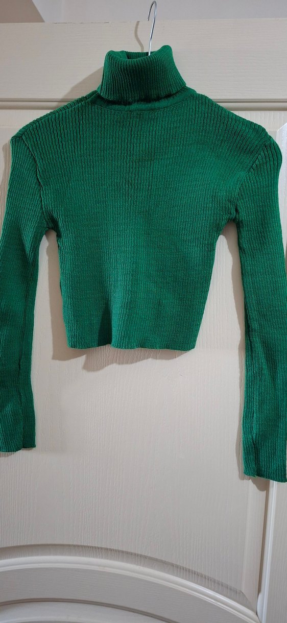 Yeşil ve eflatun renkli, fit kesim, balıkçı yakalı ve uzun kollu triko kazak. Crop boy 40cm. Hiç giyilmedi