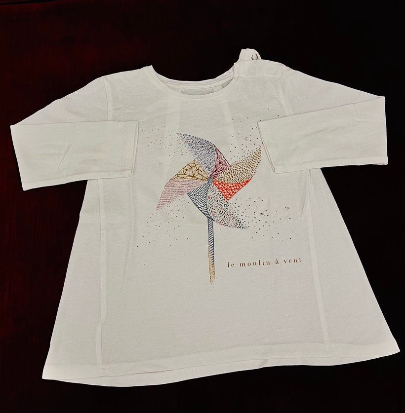 Bir tanesi Zara marka Pamuklu, uzun kollu, bol kesim beyaz tişört. Baskılı yel değirmeni deseni ve omuzda düğme detayı bulunur. Etiketini rahatsız ettiği için kesmiştim. Orijinal Zara, kumaş kalitesi kendini gösteriyor zaten. Diğeri Mango marka . Her ikisi de 2-3 yaş aynı dönemde az kullanıldı temiz ve sorunsuzdur.