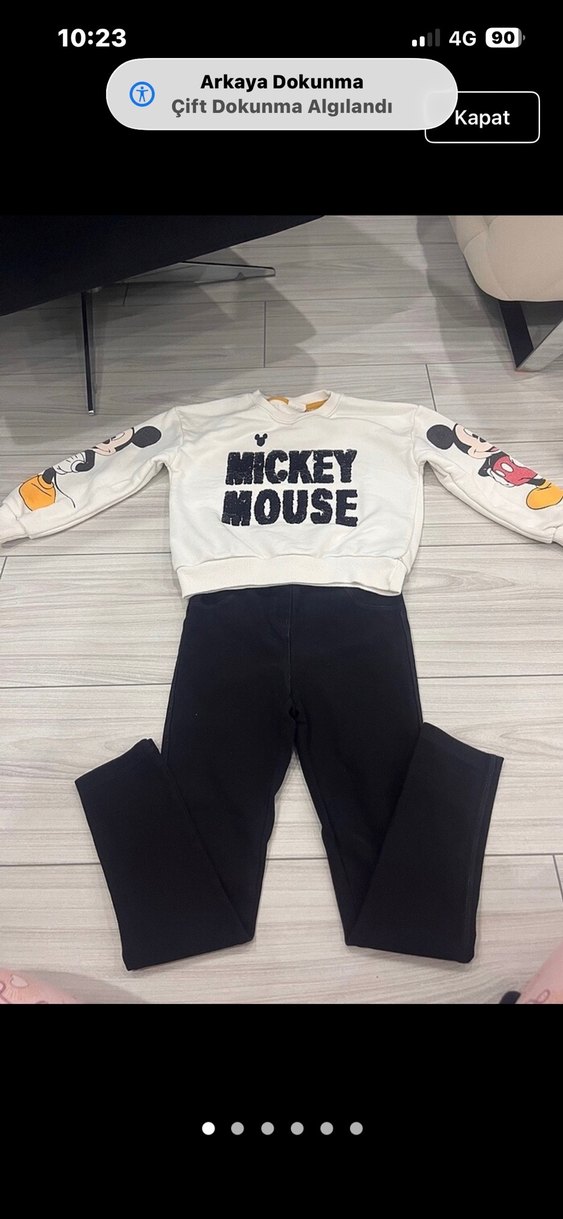 Beyaz, baskılı uzun kollu sweatshirt ve koyu renkli, fitted eşofman altından oluşan kız çocuk takımı. Sweatshirtte düğme detayı ve Mickey Mouse baskıları bulunur.