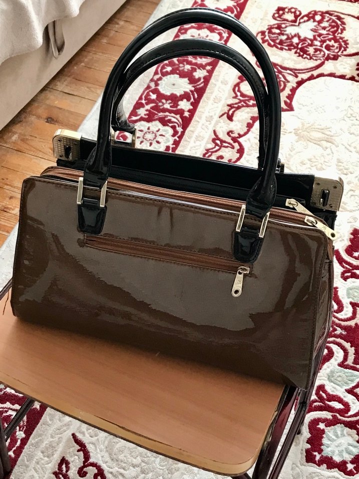 Parlak kahverengi deri ve siyah saplara sahip tokalı kadın çantası, günlük kullanıma uygun modern klasik tarzda. Düz yüzey ve önünde fermuarlı cep bulunur. 2 adettir fiyat ikisi için geçerlidir. Astar fermuar vs sağlam sorunları yok İhtiyacı Olan kaçırmasın alsın