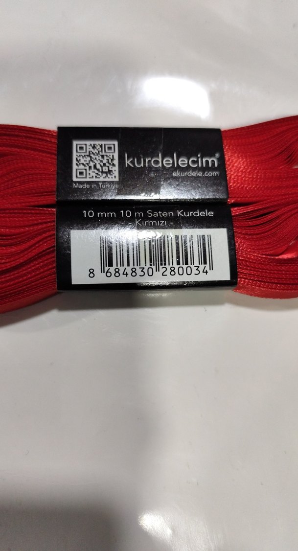 Kurdelecim markasına ait, 10 mm genişliğinde ve 10 metre uzunluğunda kırmızı saten Kurdele uygun, pürüzsüz dokulu.
