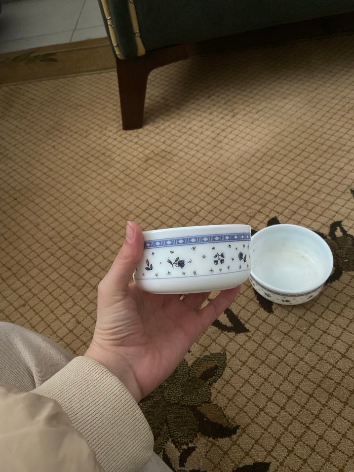 Beyaz seramikten yapılmış, kenarında ince mavi çiçek desenleri bulunan kase. ️