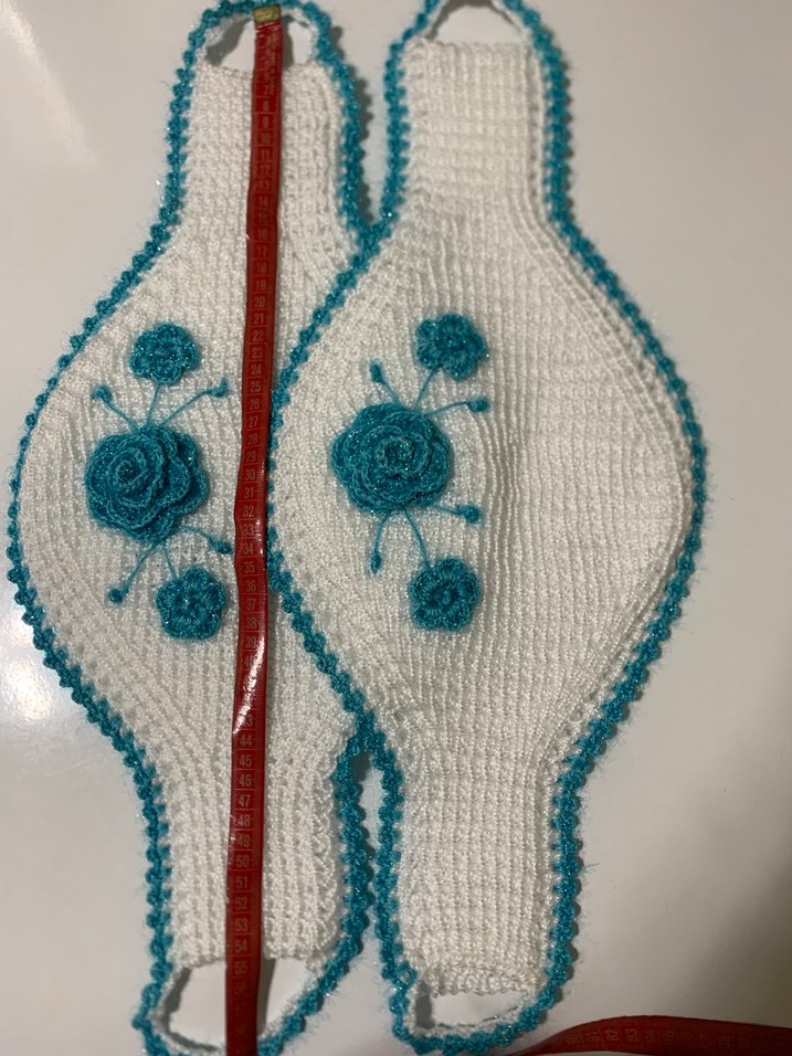 Turkuaz kenarlı, çiçek motifli örgü banyo lifi kullanışlı ve el yapımı bir görünüm sunar.
