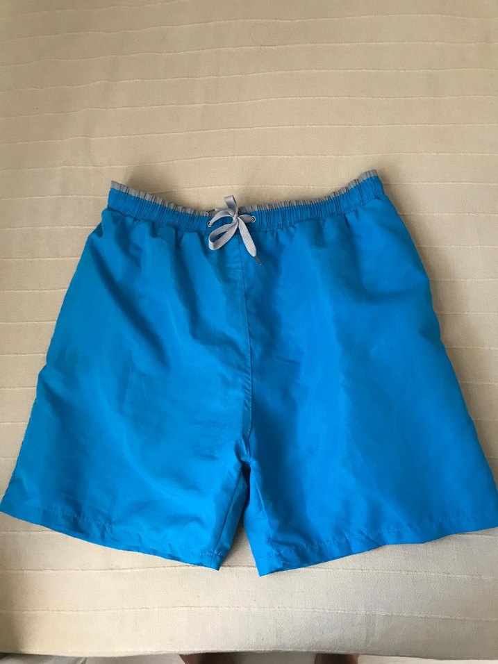 Rahat kesim, canlı mavi renkte erkek yüzme şortu. Ayarlanabilir bel bandı ve midi boyuyla plaj için uygun, günlük sokak stiliyle uyumlu.