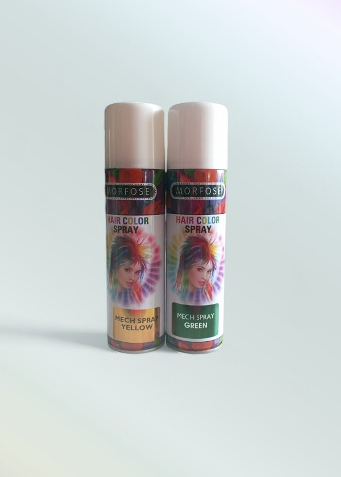 2 Adet Morfose Renkli Saç Spreyi 150'er ML. Sarı ve yeşil renklerdedir. Biri tam dolu diğeri yarım doludur.