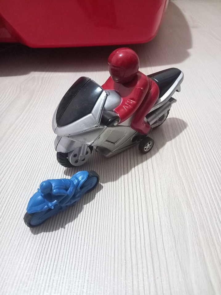 Kırmızı büyük ve mavi küçük olmak üzere iki renkli oyuncak motosiklet ve sürücü figürlerinden oluşur. ️Büyük olan 16 cm boyundadır. Ürünler plastikdir.