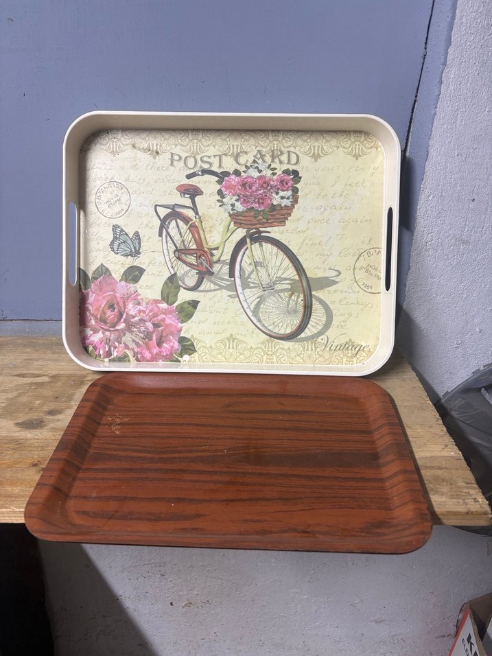 Bej renkli, pastel tonlarda bisiklet ve çiçek desenli vintage mutfak tepsisi. Dayanıklı malzeme ve taşıma kolaylığı için yan kulplar içerir.