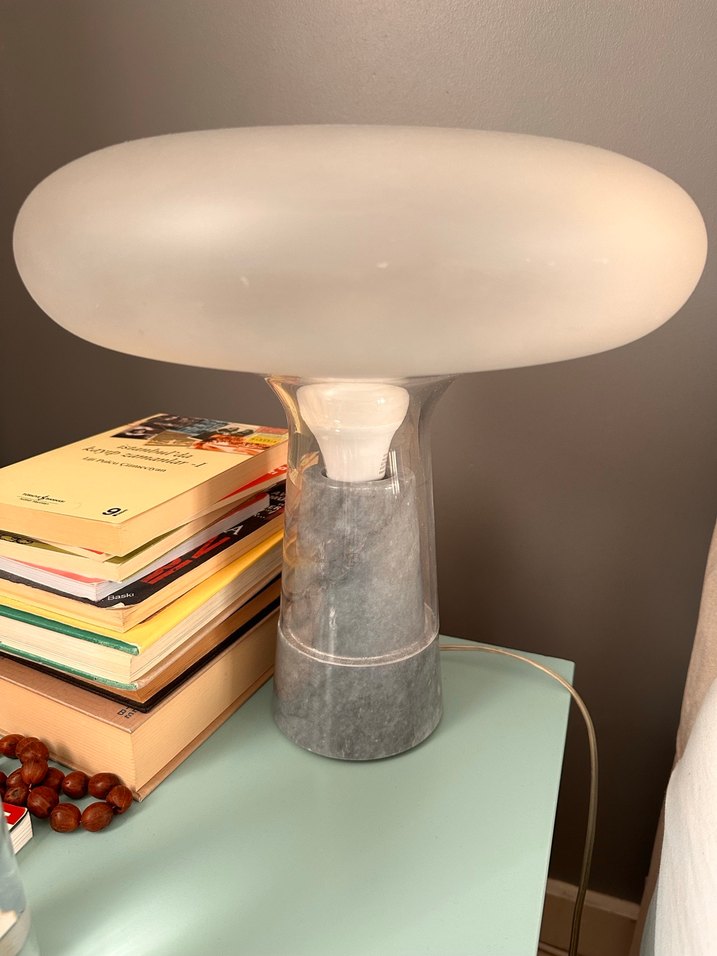 Beyaz mat cam abajur ve gri mermer tabanlı masa lambası, yumuşak ışık verir. Modern tasarıma sahip, şeffaf cam gövde ile desteklenmiştir.