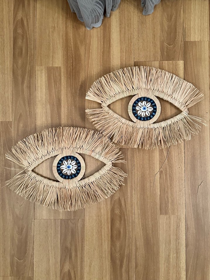 Bej renkte, püskül detaylı ve ortasında kabuk tasarımı bulunan dekoratif göz figürleri, ev dekorasyonu için uygun.