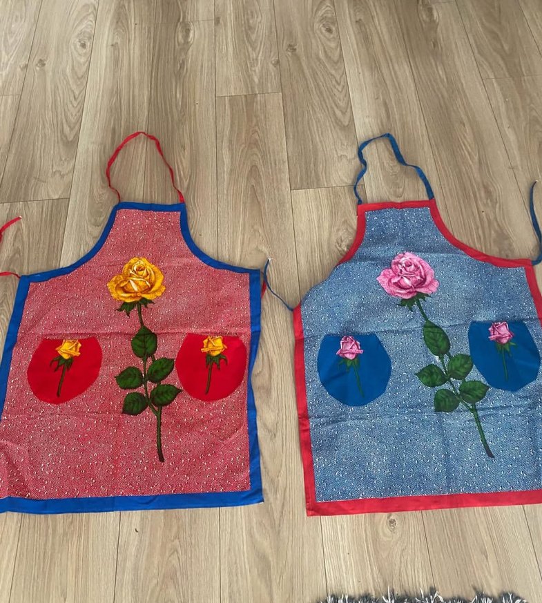 el işi sandıktan çıkma Canlı çiçek desenli, cepli ve renkli mutfak önlükleri. Her önlük büyük gül deseni içerir. iki adet fiyatıdırir