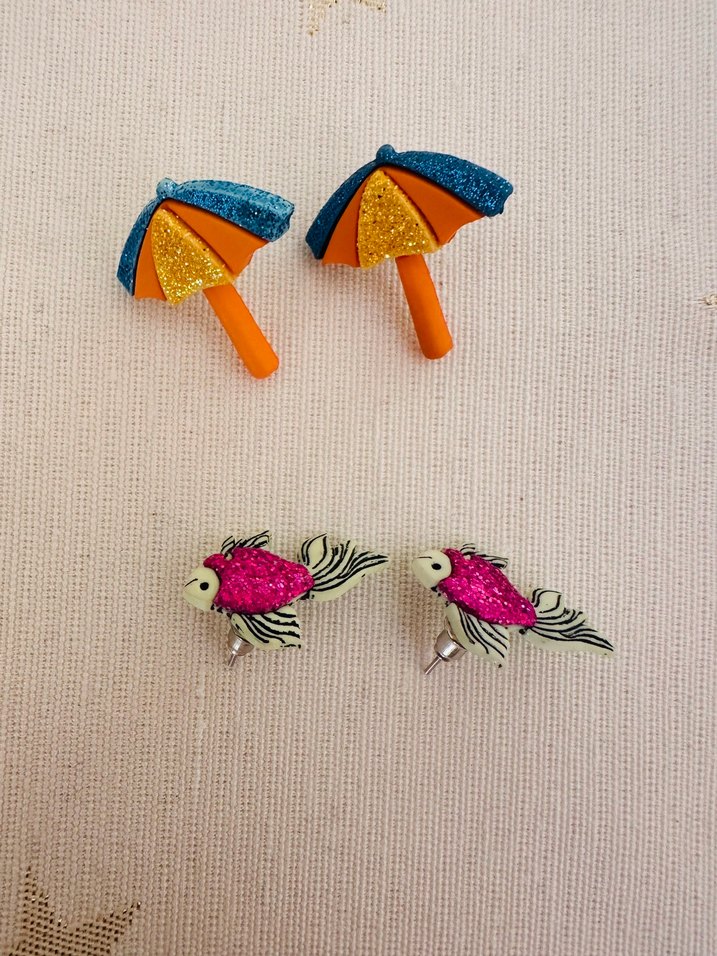Pullu şemsiye ve işlemeli balık figürlü renkli küçük aksesuarlar, bohem ve retro pop kültür tarzını yansıtıyor. 2 ADET Seramikten El ile Yapilmis Semsiye ve Balik Formunsa Kupe. Tek yapilmistir, baska birinde goremezsiniz #elisi #elemegi #unique #oneofakind #kupe #earrings