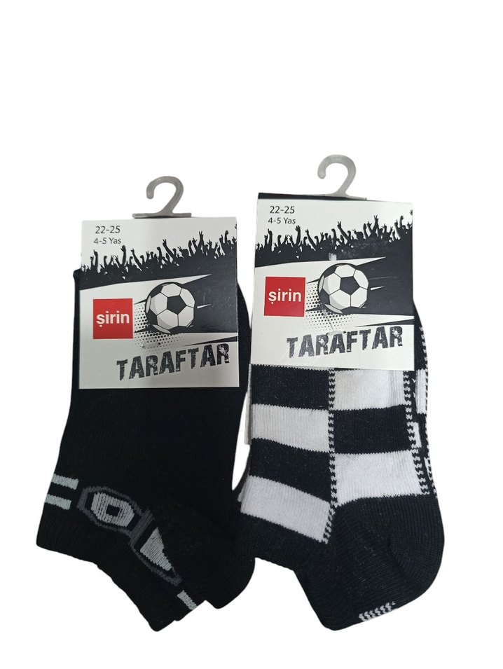 Siyah ve gri renklerde, baskılı desenli erkek çocuk çorapları, 22-25 numara. Şirin markasına ait futbol temalı bir çift içerir. ⚽