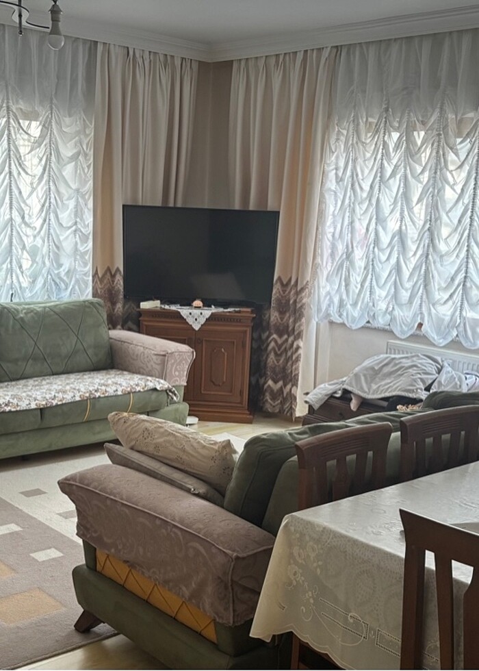 SAÇMA SAPAN FİYAT TEKLİF EDENLERE CEVAP YAZMIYORUM eni yukarıdan kornişten 215x275 cm diğeri 290x 275 cm büzgülerini istediğiniz uzunluğa göre büzebilirsiniz düz tül ve peluşlu tül sıra sıra dikilmiş olup 2 ay kullanılmıştır BEMBEYAZDIR YEPYENİDİR 2 perdenin toplam fiyatı 5000 tl dir bu şekildeki perdelerin metre dikim fiyatlarını araştırın uygun yazdığım anlaşılacaktır büyük pencereniz varsa ikisinide aynı camda kullanabilirsiniz fiyat SONDUR her iki pencere görüntüsü fotolarda