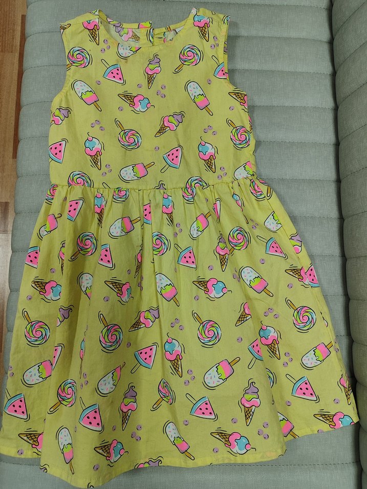 Kolsuz, renkli baskılı ve fırfırlı kız çocuk elbisesi. Rahat kalıp ve sentetik yumuşak kumaştan, straplez yaka ile pop kültür tarzında.