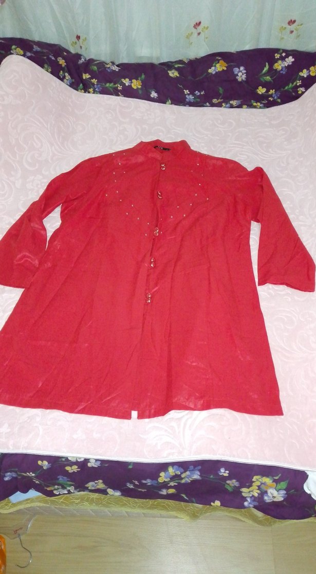 1 adet kırmızı diz üstü uzun düğmeli üst 1 adet gri uzayan kumaştan bol kalıp düğmeli üst yırtık vesaire yok yıkayıp direkt kullanabilirsiniz
