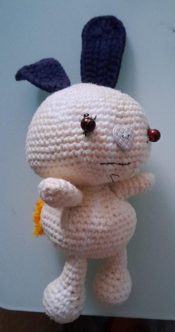 2 adettir Koyu renk kulaklı, yüzünde nakışlı kalp detayı bulunan beyaz el örgüsü tavşan peluş oyuncak. Düğme gözlü ve yumuşak dokulu.