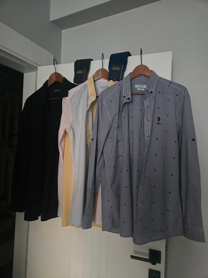 Pamuk kumaştan üretilmiş, düğmeli ve yakası kesik detaylı 2 adet L beden ekoseli polo erkek gömleği. Normal boy ve regular fit kesimle günlük kullanıma uygundur. Bir adet mavi marka XL beden pamuklu siyah gömlek .Yanlarında sıfır 2 adet çorap.Yakalarında yıpranma yok