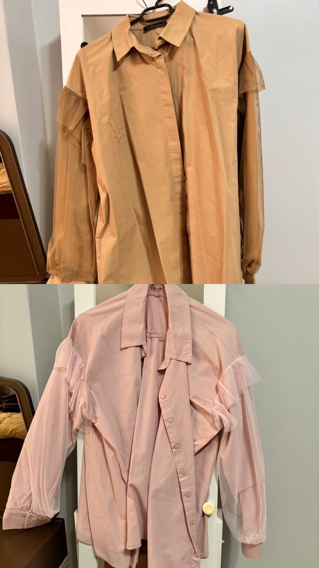 Bej ve pastel renklerde, yumuşak keten kumaştan, uzun kollu, fırfırlı detaylı, normal uzunlukta ve notched lapel yakalı kadın gömlekleri. Günlük kullanıma uygun.