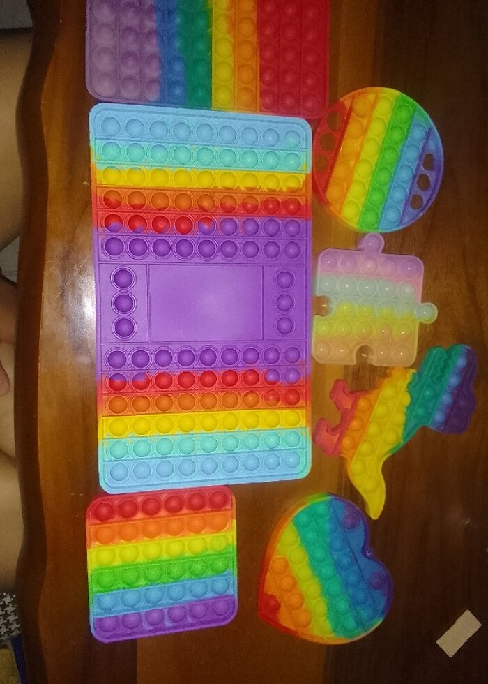 7 adet 2si Jumbo popit sadece daire olanda hasar var onun dışında hepsi sapasağlam 1 adet dizor şekilli 1 adet orta boy kare 1 adet büyük kare 1 adet kalp şekilde 1 adet puzzle şekilli 1 adet daire ve 1 adette çif kişilik büyük dikdörtgen şekillinde 7 adet çocuk yetişkin fark etmez eğitici popit duyu oyuncağı ilgilenenleri dm bekliyoruz