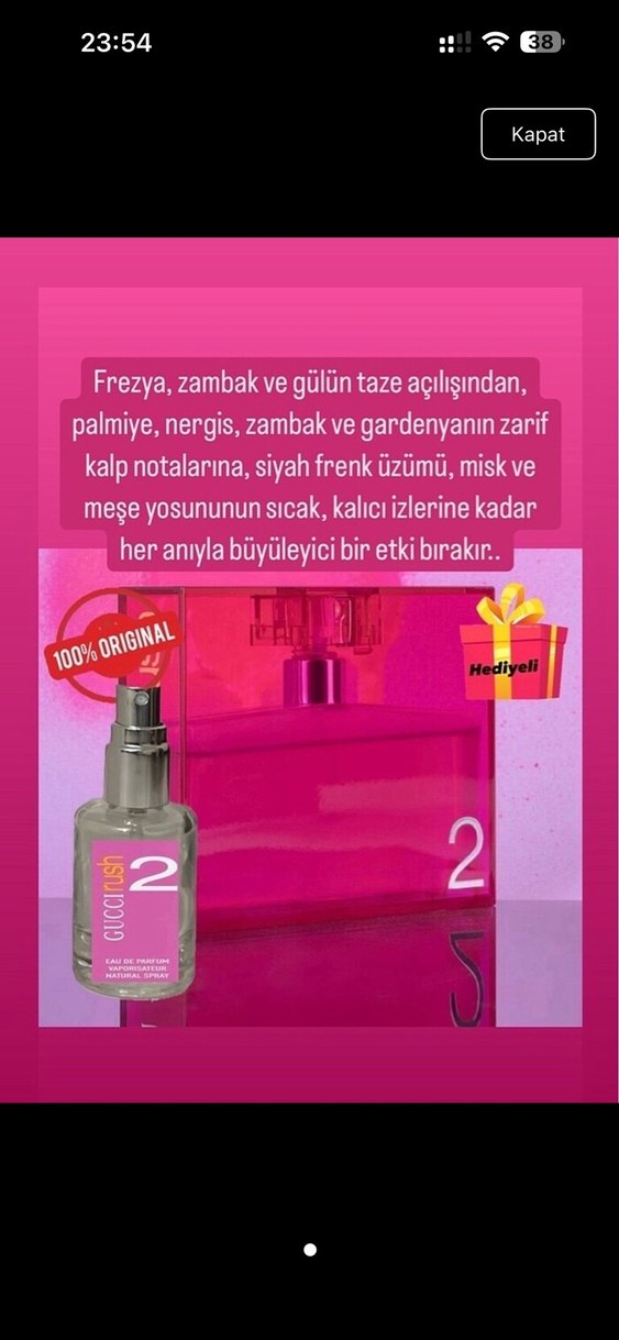 Orijinal şişesinden 10 ml. spreyli cam şişeye aktarılmış şekildedir, iade yoktur. 20-30-50 ml. istekleriniz için ilan açtırabilirsiniz. Frezya, zambak ve gülün taze açılışından sonra palmiye, nergis, zambak ve gardenyanın zarif kalp notaları ile devam eder. Siyah frenk üzümü, misk ve meşe yosununun sıcak, kalıcı izleriyle büyüleyici bir etki bırakır.